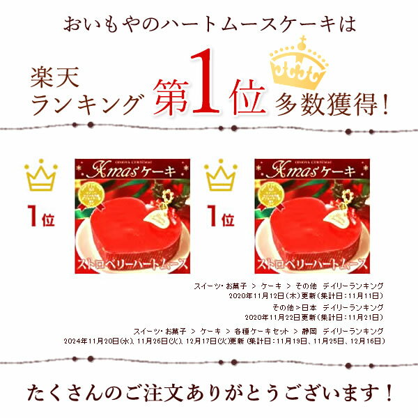 \早割&限定クーポン!/ クリスマスケーキ 予約 2025 お取り寄せ 予約 いちご ムース ムースケーキ ケーキ ハート 4号 2人 3人 4人 冷凍 冷凍ケーキ ホールケーキ 苺 ストロベリー スイーツ お菓子 洋菓子 可愛い かわいい おしゃれ おいもやクリスマス2025 早割キャンペーン ★本日~早割 1,690円~ 11/21~早割 1,720円~ 12/11 15:00~1,780円~ ※早割価格は、一定数に達し次第早期終了となる場合がございます。 商品説明 商品名 ストロベリーハートムースケーキ サイズ 12cm×11cm×3cm(横×縦×高さ) 目安:2人分 原材料 乳等を主要原料とする食品(国内製造)、糖類(砂糖、水飴)、牛乳、苺ピューレ、卵、ラズベリーピューレ、小麦粉、ゼラチン、洋酒、薩摩芋ペースト、植物油脂、加工油脂、濃縮苺シロップ/トレハロース、ペクチン、着色料(赤102、カラメル)、香料、乳化剤 賞味期限 冷凍で2026年1月10日、解凍後は要冷蔵で2日以内 その他 ※ヤマト運輸の【冷凍便】にてお届けいたします。 付属品の飾り付けは冷蔵庫で解凍してからお願いいたします。 完全に解凍するまでに冷蔵庫で約5時間ほどかかります。 お召し上がり前日の到着指定をおすすめ致します。 ※冷凍便となるため、生芋と同梱は出来ません。 ※パッケージのデザインや付属品(ヒイラギの飾りなど)は、予告なしに変更になる場合がございます。 あらかじめご了承下さい。 販売者 株式会社 おいもや 静岡県掛川市大渕9641 \まだまだあります★Xmasケーキ&プレゼント/ 人気ケーキ・花&スイーツsetなど♪ おすすめ用途 クリスマス Christmas Xmas X’mas 2025 クリスマスプレゼント 子ども会 贈る相手 女性 男性 両親 母 父 お母さん お父さん 義母 義父 祖父母 祖母 祖父 おばあちゃん おじいちゃん 親戚 義実家 友人 友達 上司 部下 先輩 後輩 社長 目上の人 取引先 会社 職場 10代 20代 30代 40代 50代 60代 70代 80代 90代 0歳 1歳 2歳 3歳 4歳 5歳 6歳 7歳 8歳 9歳 10歳 20歳 30歳 40歳 50歳 60歳 70歳 80歳 90歳 1人 2人 3人 4人 5人 一人 二人 三人 四人 五人 関連ワード クリスマススイーツ クリスマスケーキ Xmasケーキ おすすめ 人気 ギフト gift プレゼント お取り寄せ トレンド おしゃれ オシャレ お洒落 可愛い かわいい スイーツ お菓子 和菓子 洋菓子 お芋 さつまいも サツマイモ 薩摩芋 さつまいもスイーツ 食べ物 予約 2025 贈り物 贈答 楽天 人気ランキング ホール ホールケーキ ムース ムースケーキ 苺 苺ムース ハート チョコプレート 4号静岡産イチゴ使用!ハート型Xmasケーキ 大切な恋人・ご夫婦・友達と一緒に♪ おいもやクリスマスケーキ・プレゼント 2025定番の洋菓子や花・フラワーギフト・スイーツなどXmasプレゼント 今年のクリスマスは、きっと特別になる ——— ハート型のオリジナルケーキ『ストロベリーハートムースケーキ』は、国内産イチゴをふんだんに使用。 甘酸っぱい苺ムースと、ほのかにお芋が香るお芋スポンジの相性はバツグン。恋人同士やご夫婦など、おふたりで召し上がるのにぴったりのサイズ♪女子会にもオススメです。 ムースケーキとともに、素敵なクリスマスをお楽しみください♪ 甘酸っぱい苺ムースには、静岡産のイチゴをたっぷり使用。 静岡産いちごを まるごと潰したジュースに、生クリームを合わせ、なめらかな口当たりになるように仕上げました。 さらに、苺ムースの上には、ぷるんとした食感の苺ゼリーをのせました。 ナパージュで艶を出し、見た目も美しい色鮮やかなイチゴのクリスマスケーキに仕上がりました。 苺の甘酸っぱい香りがたまりません♪ しっとりとしたお芋のスポンジは絶品!当店でも人気のあるシフォンケーキのようなお味で、 お口に入れるとサツマイモ本来の甘さが感じられ、他にはないお味に♪ また、ほのかにお芋の香りがするので、香りも楽しめるクリスマスケーキに仕上がりました! おいもやクリスマスケーキ・プレゼント 2025定番の洋菓子や花・フラワーギフト・スイーツなどXmasプレゼント